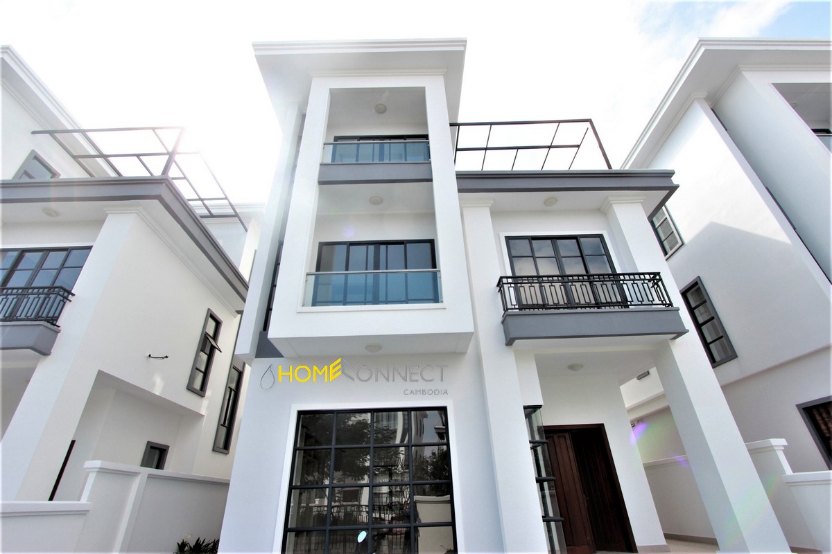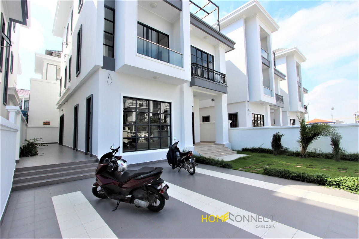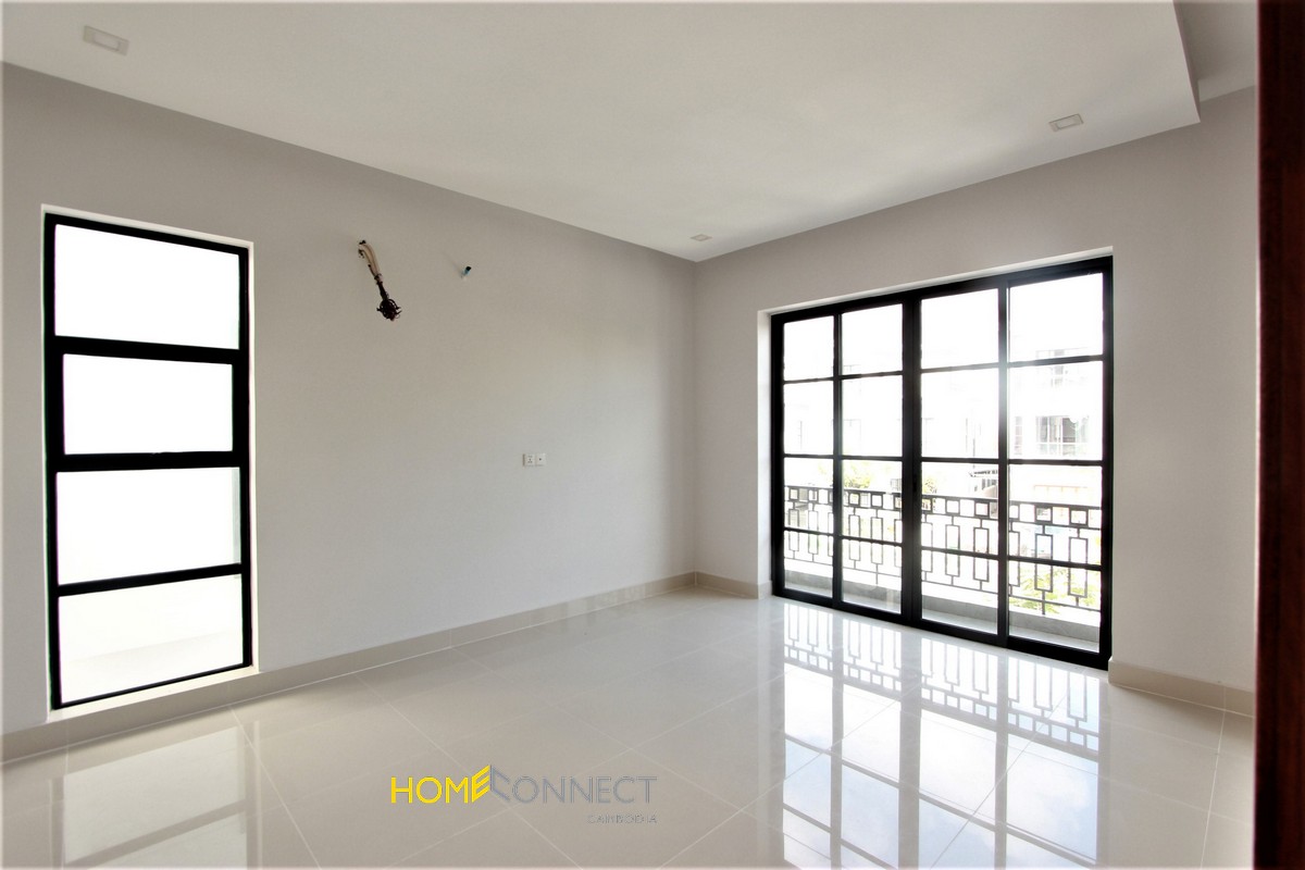 This is a brand new villa with no furniture so you can pick and choose to your own liking or if you have your own then that will be good. Nice and bright with all the windows around the villa. Just east of the city in the suburbs away from the city yet still close enough to BKK1 and Aeon Mall 1. An international school is close by and the area is being develop so there will be more to come.