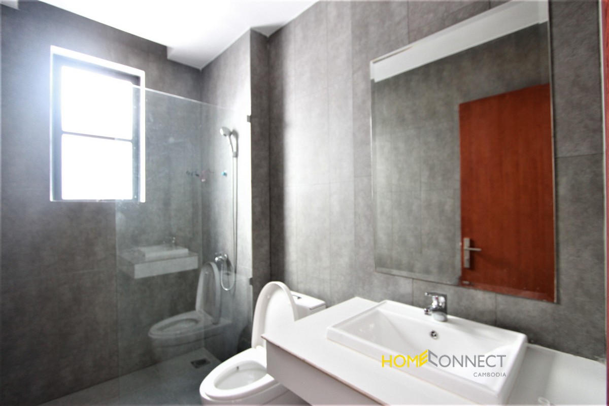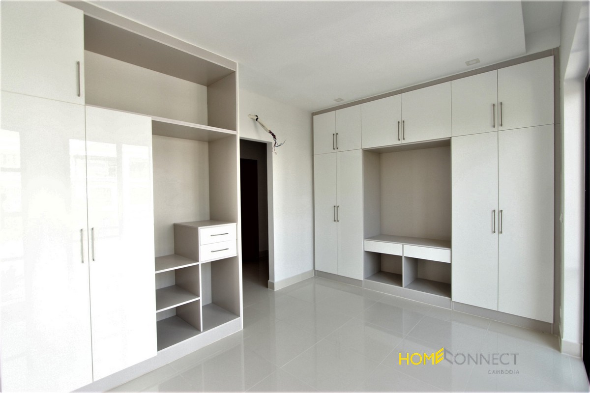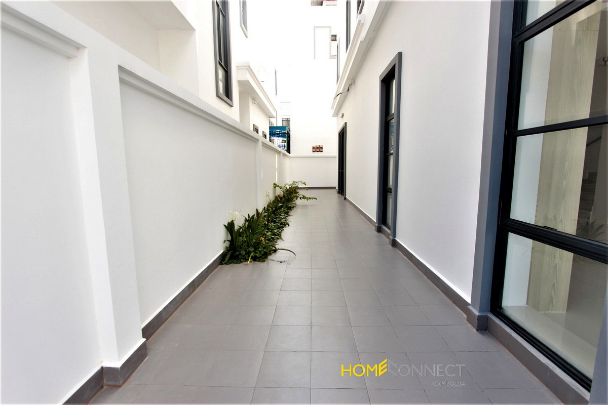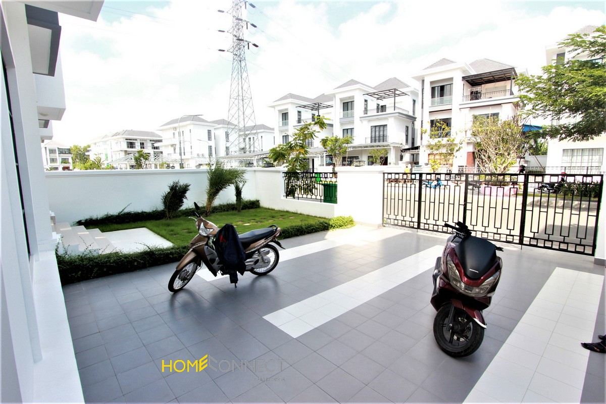 This is a brand new villa with no furniture so you can pick and choose to your own liking or if you have your own then that will be good. Nice and bright with all the windows around the villa. Just east of the city in the suburbs away from the city yet still close enough to BKK1 and Aeon Mall 1. An international school is close by and the area is being develop so there will be more to come.