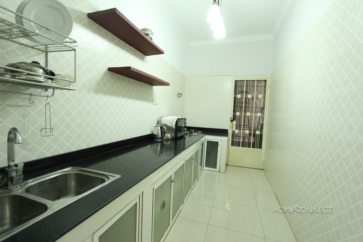 This budget friendly, two bedroom two bathroom apartment is now for rent near to Phnom Penh’s Old Market, commonly known in Khmer as Phsar Chas. The house comes fully furnished and includes free cable TV in the rental price. The bedrooms are both comfortable and have their own private bathrooms. There is a large balcony offering a lot of fresh air and a nice breeze. The kitchen is spacious with a lot of counter space and offers a stove top burner as well as a convection oven. There is a large living area offering a great place to relax after a long day of work. The location of the apartment is very near to Old Market and just a few streets away from the popular Riverside area of Phnom Penh. Nearby to many international eateries as well as several convenience stores and shopping malls.