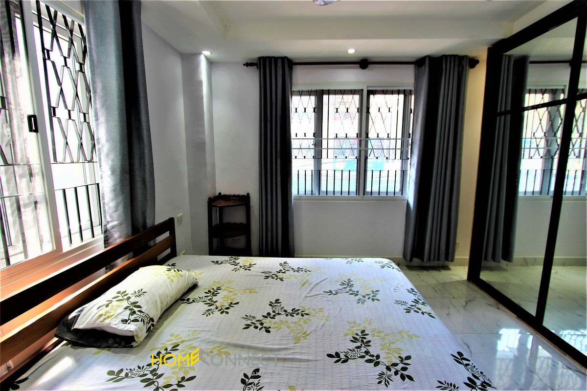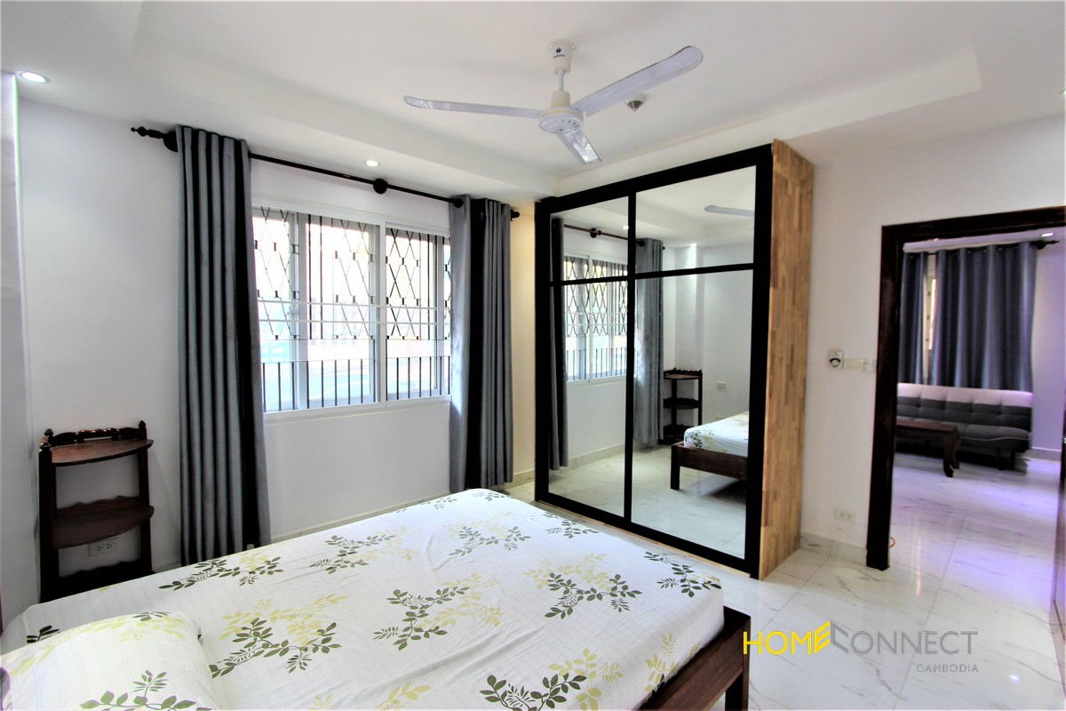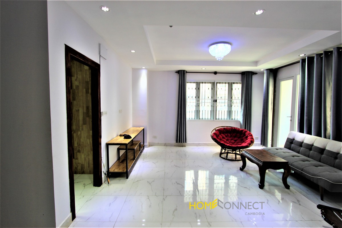 Modern 1 bedroom apartment on the first floor that have modern furniture, three rooms that is all separated from one another so its a true one bedroom. Plenty of light and air coming into all the rooms so there is no dark area. A great place for a couple looking to live in an area that do not have construction and the noise around. Close by you have bkk 1, Orrussey Market, Olympic Stadium.