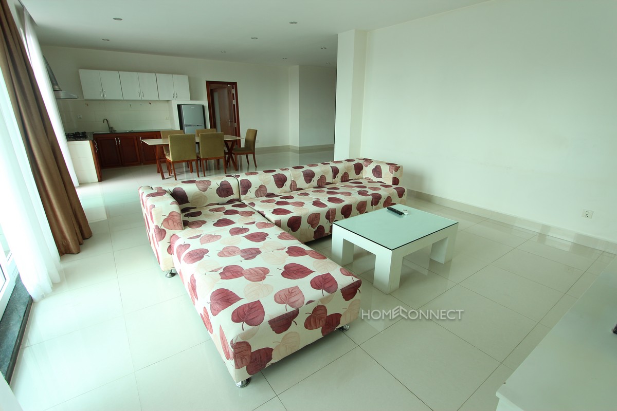 This modern three bedroom apartment is situated close to Monivong boulevard on a quiet street. The apartment has a modern clean design and is bright and airy making it a pleasing living space. Their is a good sized balcony to the front and a secure parking area on the ground floor of the building. The management include internet, cable TV and 24 hour security in the rent. The furniture compliments the design of the building and a cleaning service is available at an additional cost.