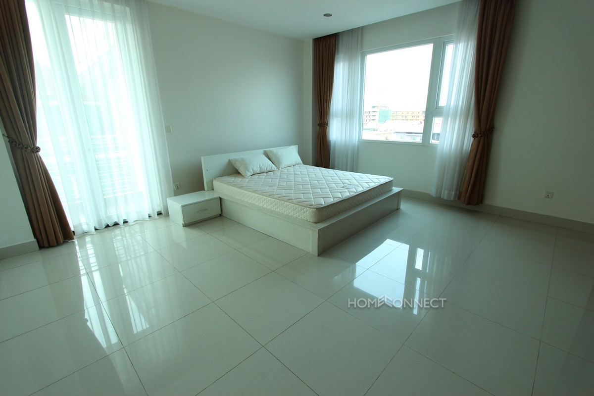 This modern three bedroom apartment is situated close to Monivong boulevard on a quiet street. The apartment has a modern clean design and is bright and airy making it a pleasing living space. Their is a good sized balcony to the front and a secure parking area on the ground floor of the building. The management include internet, cable TV and 24 hour security in the rent. The furniture compliments the design of the building and a cleaning service is available at an additional cost.