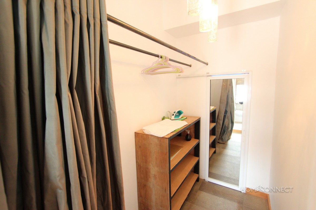 This newly renovated apartment is located in the heart of Daun Penh near Riverside, Phnom Penh. Situated over two floors the apartment has been stylishly decorated and comes fully furnished. The downstairs is an open plan kitchen, dining area and lounge while upstairs the spacious bedroom leads onto a private terrace. If your looking for an apartment with character, something different from the modern condo then we suggest a visit.